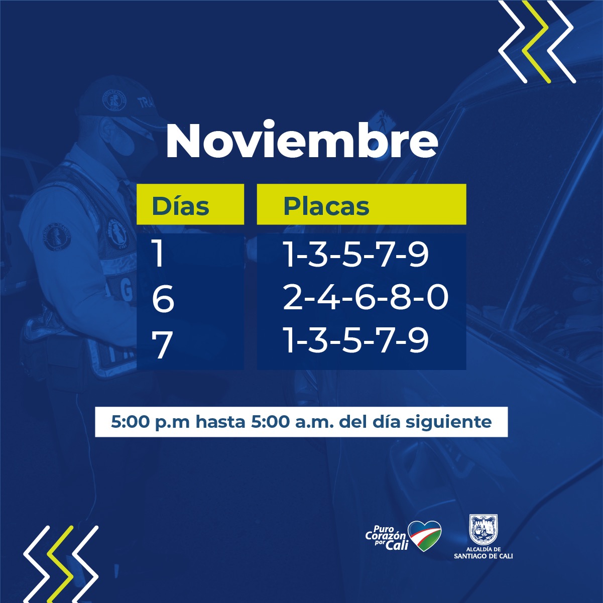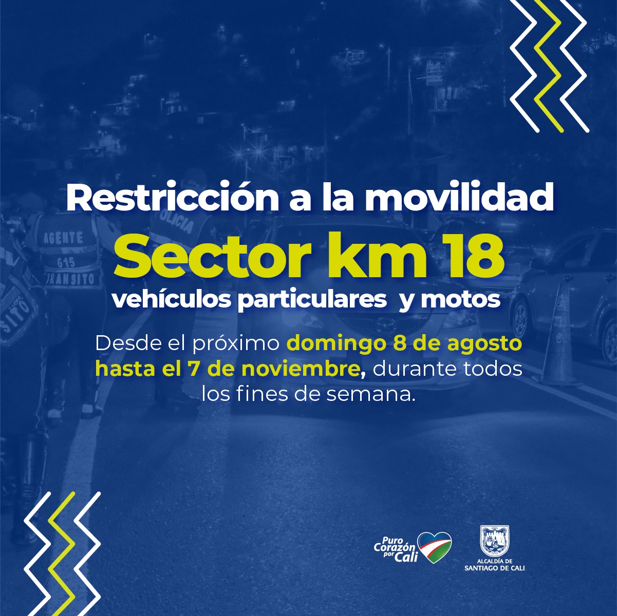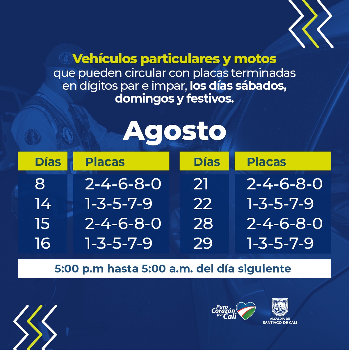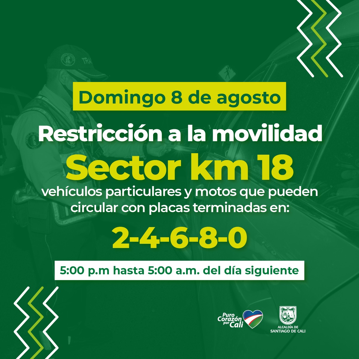 La medida estará regulada por el último número de la placa del vehículo y la restricción aplicará exclusivamente para el tránsito en el sentido vial desde Santiago de Cali hacia el municipio de Dagua (Valle del Cauca) y funcionará en el horario comprendido entre las 5: 00 pm y las 5:00 am del día siguiente.