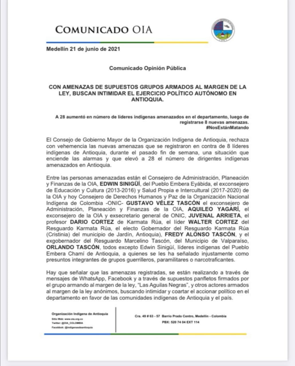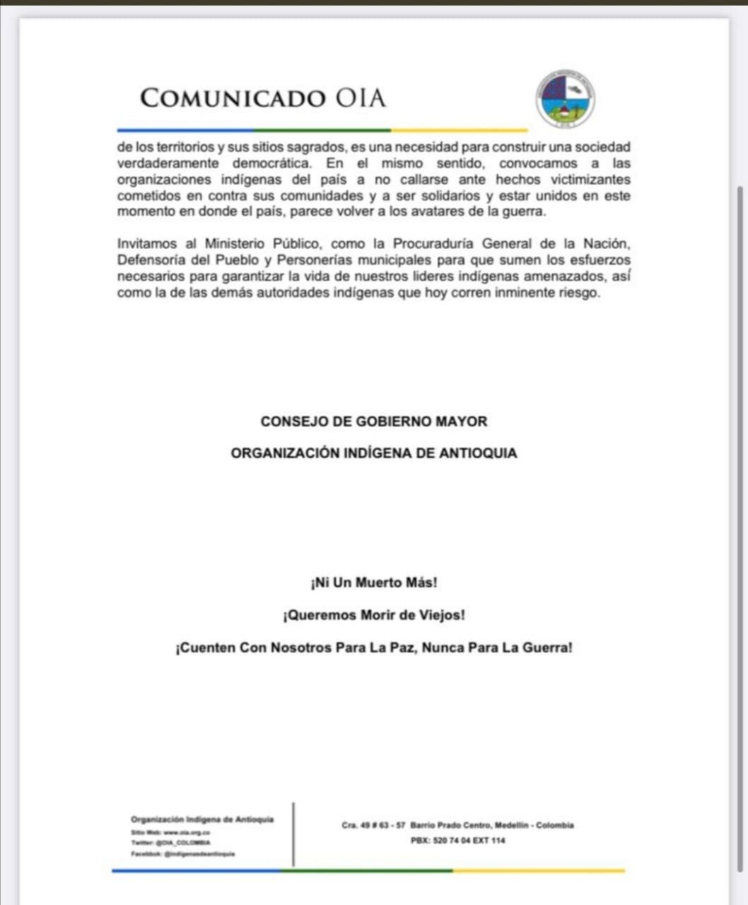 La Organización Indígena de Antioquia OIA alertó que las nuevas amenazas van dirigidas contra líderes. “Estas amenazas que buscan “intimidar y coartar el accionar político en el departamento en favor de las comunidades indígenas de Antioquia y el país”.